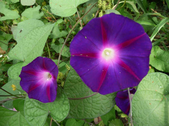 Common Morning Glory, Ipomoea purpurea, is a twining vine from Mexico and Central America, with deep purple ethereal flowers that have a white glowing throat. It is a perennial plant that is usually treated as an annual species, planted by seed.